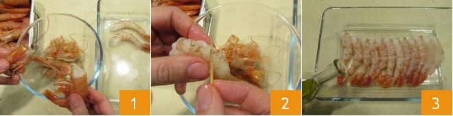To make the shrimp in crust, first clean the shrimp, making sure not to remove the tail: detach the head 1, the legs, and the shell, then remove the intestine, or the black thread on the back, using a toothpick 2. For best results in this step, you can consult our guide How to clean shrimp. Lay the cleaned shrimp in a baking dish and season them with olive oil 3.