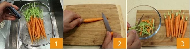 To prepare the shrimp sautéed in teriyaki sauce with snow peas and baby carrots, start by thoroughly washing the baby carrots under plenty of running water 1. Place them on a cutting board, trim them with a small knife 2, and lightly scrape the skin; shorten the green stem and set aside 3.