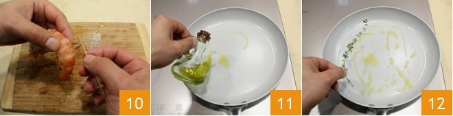 once cleaned externally, gently remove the internal intestine (the black filament) with the help of a toothpick 10 (you can also cut the back of the shrimp with a small knife and remove it by gently pulling). In a non-stick pan, place a drizzle of oil 11 and the whole sprig of thyme 12.