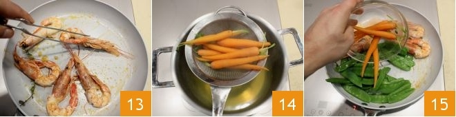 Sear the shrimp over high heat for 2 minutes on each side, turning them with kitchen tongs for even cooking 13. When the carrots are ready, drain them well 14 and add them to the shrimp along with the snow peas 15;