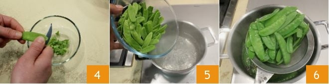 Take the snow peas, remove the two ends 4, then rinse them under running water. Place a pot with plenty of salted water on the stove: when the water is about to boil, cook the snow peas for 5 minutes so they soften but do not disintegrate 5. Once ready, drain them, keeping the cooking water 6.