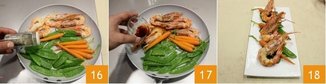 Season with pepper to your liking 16 and deglaze with teriyaki sauce 17, letting it infuse for 2-3 minutes; turn off the heat and finally plate and serve your shrimp sautéed in teriyaki sauce with snow peas and baby carrots! 18.
