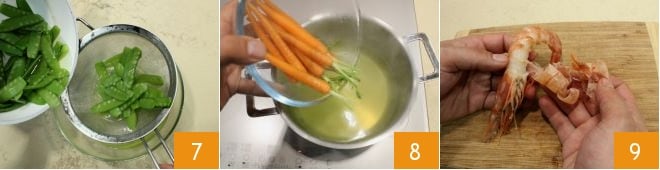 Leave the snow peas in the strainer to cool and drain well from their liquid 7. Then boil the carrots for 7-8 minutes in the reserved cooking water of the snow peas 8. Meanwhile, proceed to the How to clean shrimp: leave the head and tail intact, and with your fingers remove the shell 9;
