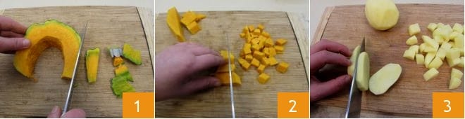 To prepare the single-serving gratin of potatoes, pumpkin, and sausage, place a pot with plenty of salted water on the stove, which you will use for the Vegetable broth. Cut the pumpkin into slices, removing the filaments and inner seeds. Remove the skin 1, then cut it into strips and then into cubes 2. Peel the potatoes with a vegetable peeler, cut them into slices 3