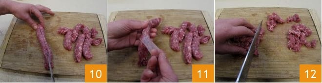 Meanwhile, cut the sausage in half 10, gently remove the casing with your fingers 11, then finely chop it with a knife or crumble it with your hands 12.