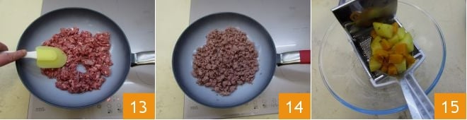 Sauté the sausage over the heat for 4-5 minutes 13, spreading it with a kitchen spatula for even cooking 14. After the necessary time, pass the cooked potatoes and pumpkin through a potato ricer 15
