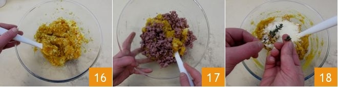 until you get a smooth purée 16. Also add the crumbled sausage 17 (set aside 3-4 tablespoons), the grated cheese, the thyme leaves 18,