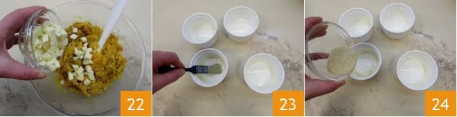 Finally, add the diced provolone, keeping aside 2 tablespoons for later use 22. Brush 6 ramekins with a diameter of 3.5 inches and a height of 2 inches with oil 23, then sprinkle them with breadcrumbs, ensuring it adheres well to the sides and base 24.