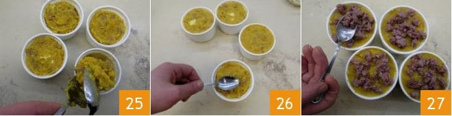 At this point, fill the ramekins to the brim with the mixture you prepared 25 and, once finished, level the surface with the back of a spoon 26. Finish your gratins by spreading crumbled sausage on the surface 27