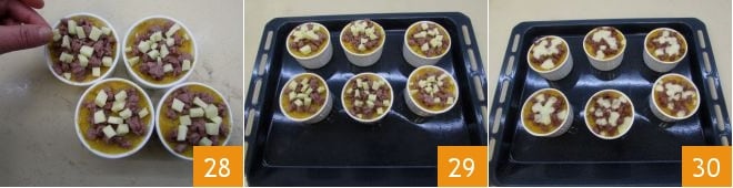 and the diced provolone you set aside 28, then arrange the filled ramekins on a baking sheet 29, baking in a preheated static oven at 392°F for 10 minutes (or at 356°F for 7-8 minutes if using a convection oven); finally, you can remove and serve your single-serving gratin of potatoes, pumpkin, and sausage directly in the ramekins 30.