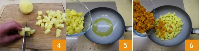 and then into cubes 4. Place a non-stick pot on the stove with oil; add the potatoes 5 and diced pumpkin 6, seasoning with salt and pepper to your liking.