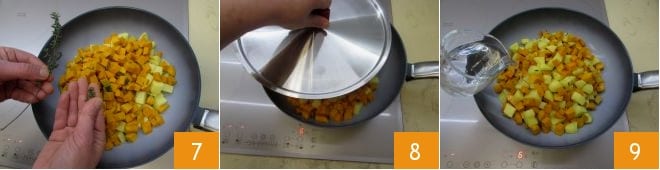 Add the thyme leaves 7 and cook for 15 minutes, covering with a lid 8 and pouring in the vegetable broth 9.