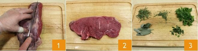 To make the sliced beef with aromatic herbs, cut the rump steak to obtain a 500 g slice about 1.5-2 inches thick (1-2). Meanwhile, prepare the herb mixture that will flavor the sliced beef: remove the woody part of the rosemary leaving only the needles, place them on a cutting board, add sage leaves, marjoram, thyme, and parsley 3, finely chop the herbs with a knife.
