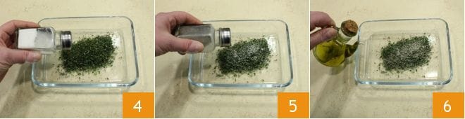 Place the obtained mixture in a bowl, season with salt 4, freshly ground black pepper 5, and olive oil 6, mix the obtained emulsion and use it
