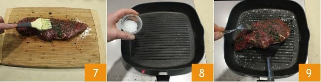 to brush the slice of meat on both sides 7. Proceed with cooking the sliced beef: put a grill on the stove, sprinkle the surface with coarse salt 8. When the grill is hot, place the slice of meat: to achieve perfect cooking, cook on both sides for a maximum of 3-4 minutes, turning it with a spatula 9. By cooking for only a few minutes, the steak will remain pink inside and retain all its juices; it is recommended not to extend the cooking time, otherwise the meat will be too dry inside.