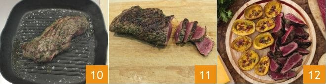 Once cooking is completed 10, place the still-hot meat on a cutting board and cut it into slices about 0.4 inches thick 11. Serve immediately the sliced beef with aromatic herbs while still hot and accompany it with tasty sides like Potato boats with cheddar and bacon 12 or, if you prefer a lighter side, serve it with a mixed salad.