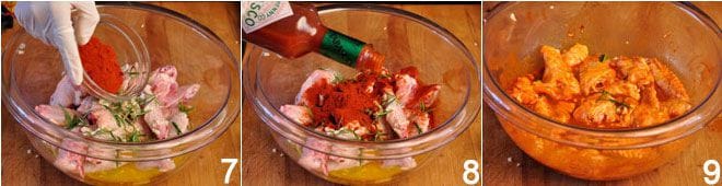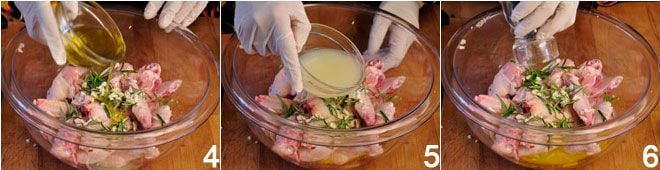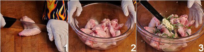 Start by cutting the chicken wings along the bone joints 1, removing the thin part. Place all the wings in a container 2. Gradually add the marinade ingredients: rosemary, minced garlic 3,