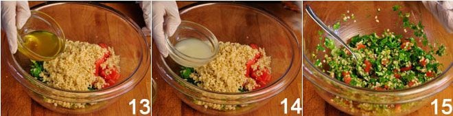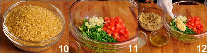 In a rather large bowl, combine the diced tomato, parsley, and scallion 11; add the cooled bulgur 12,