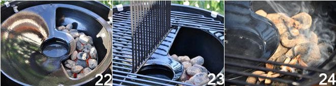 Finish setting up (22-23) before adding the chips previously soaked for about 30 minutes, and when smoke production starts 24,