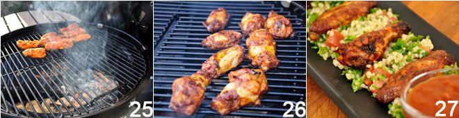 place the wings, skin-side up, on the grate 25, removing the marinade residues. The marinade should be discarded and cannot be used to baste the chicken during cooking. Close the barbecue lid, stabilize the temperature at 340°F, and let cook for about 20 minutes without opening the lid. Halfway through, turn the wings 26, close the lid again, and finish cooking for another 20 minutes. Once cooked, pour into a container and add the spicy barbecue sauce (for example, Jack Daniel's BBQ sauce and a good dose of Tabasco) and toss to coat the wings well. Serve the hot wings on a bed of tabouleh with the barbecue sauce on the side 27. The freshness of the salad will perfectly balance the spicy, spicy, and smoky taste of the chicken wings.