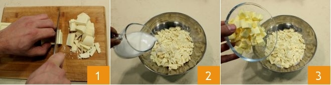 To make the snowflake cake, start with preparing the three white chocolate bases. Finely chop the white chocolate with a knife 1, then melt it in a bain-marie with warm milk 2 and butter cut into pieces 3, being careful that the water underneath does not touch the container.