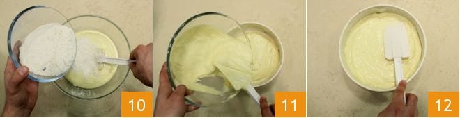 Once the mixture is whipped, transfer it to a bowl and add the dry ingredients along with the vanilla bean seeds a little at a time, folding with a spatula from bottom to top to mix all the ingredients well 10. At this point, place 2 steel rings lined with strips of parchment paper, one with a diameter of 6.3 inches and the other 4 inches, on a buttered baking sheet lined with a sheet of parchment paper. Pour the batter into the two rings until they are ⅔ full, and pour the remaining batter into a buttered springform pan lined with parchment paper measuring 8.7 inches 11, leveling the surface well 12. Bake the rings first: in a preheated static oven at 338°F for 30 minutes for the smaller cake (or at 302°F for 20 minutes if using a convection oven) and for 45 minutes for the medium one (35 minutes if using a convection oven). Once baked, remove from the oven and cook the larger cake at the same temperature for 60 minutes (50 if using a convection oven). If the surface of the cakes darkens too much during baking, cover with aluminum foil because the batter, containing a lot of sugar, tends to darken.