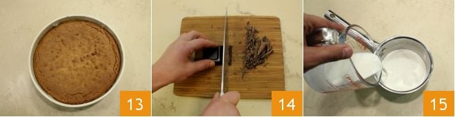 When the cake is ready 13, let it cool on a wire rack along with the smaller ones. Meanwhile, prepare the dark chocolate ganache: chop the dark chocolate 14, then place a saucepan with cream on the heat to warm it 15.