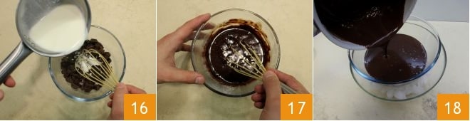 When the cream is about to boil, pour it over the chopped chocolate 16, stirring with a whisk to melt it completely 17. Transfer the chocolate and cream mixture to a bowl containing ice 18 and