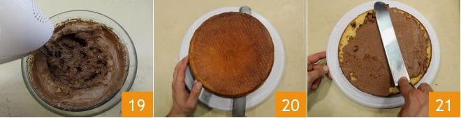 whip it for 10-15 minutes with an electric mixer with whisks 19. When the larger cake has completely cooled, cut it in half 20 and use a spatula to spread a portion of the ganache you prepared on the base layer 21.