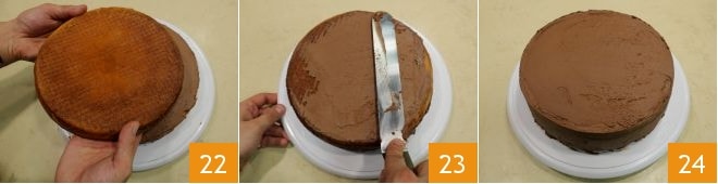 Reassemble the cake by placing the other disc on the filling 22, then cover the entire surface with some of the ganache 23, spreading it evenly on all sides 24. Let the cake set in the refrigerator for at least 30 minutes, then proceed the same way with the other two smaller ones.
