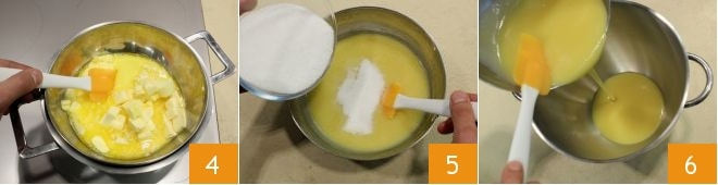 Stir with a spatula 4, then add the sugar 5 and let it dissolve completely; turn off the heat and let it cool. Place the butter, chocolate, and milk mixture in the bowl of a stand mixer fitted with a whisk 6 and start whipping.