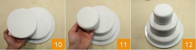 Place the medium cake 10 and then the smaller one 11, stacking them one on top of the other 12.