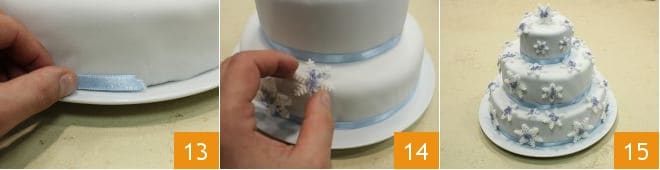 decorate the base of each tier with the blue satin ribbon 13. Take the edible glue, brush the back of the snowflakes. Gently attach them to the cake, distributing them on each tier 14, pressing with your fingers for 1 minute so they adhere well: your beautiful snowflake cake is ready to be served and enjoyed 15!
