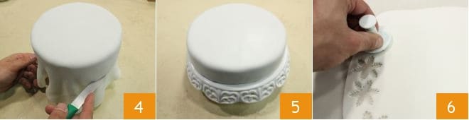 then trim the edges with a smooth-bladed knife 4, removing the excess part that you will save for the final decorations. Once ready 5, cover the other 2 smaller cakes in the same way. Knead the leftover sugar paste you saved and roll out the paste on a work surface dusted with powdered sugar; with specific cutters of 3 different sizes, cut out snowflakes 6.
