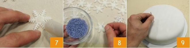 Take the pearl-colored edible glitter pen and decorate the snowflakes you obtained 7. Take the blue glitter sugars, distribute them on the snowflakes 8, and let them dry for one night. Now you can assemble the cake: insert 4 plastic rods (the same height as the base) in the center of the larger cake 9 and stack a cardboard circle with a diameter less than 6.3 inches on top.