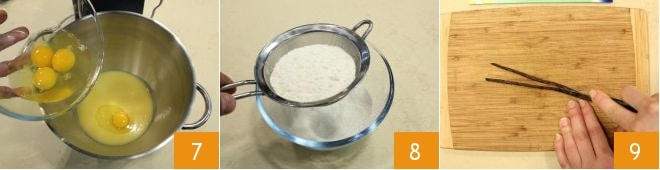 Add the eggs at room temperature one at a time, waiting for the previous one to be well incorporated before adding the next one 7. Sift the flour and baking powder 8, then cut the vanilla bean lengthwise and scrape out the seeds with a small knife 9.