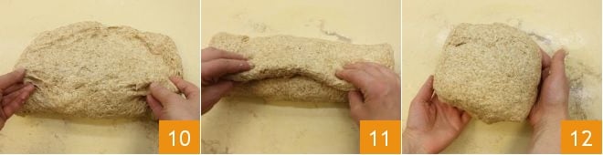transfer the dough here, so it won't stick, and you won't need to add more flour. Shape the dough into a rectangle 10, fold over the long sides 11, then fold over the short sides 12.