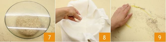 Transfer the dough to a bowl, cover with plastic wrap 7 and let rise in the oven turned off with the light on for 2 hours. Take the bread proofing basket, the bannetons. Line it with muslin and flour it generously 8, If you don't have muslin, you can use a clean tea towel. Grease a work surface with oil 9
