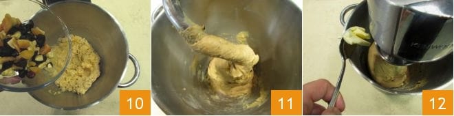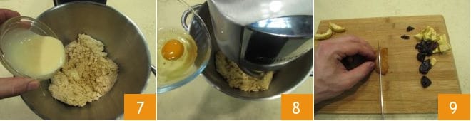When the eggs are absorbed, stop the mixer, then add the condensed milk 7, then still with the hook, mix and add the last of the 4 eggs 8. On a cutting board, chop the dried fruit into coarse cubes 9
