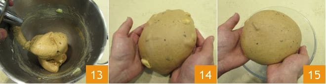 and continue working until you get a smooth and well-kneaded dough 13. Take the dough from the mixer and work it a little on the board, just to give it a round shape 14. Place it in a lightly buttered bowl 15 and let it rise for 2-3 hours covered with plastic wrap in an off oven with the light on.
