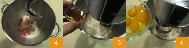 pour the orange juice 4 and start mixing with the hook, then add the herbal liqueur 5. Start kneading for a few seconds still with the hook and then pour in 3 eggs, one at a time 6.