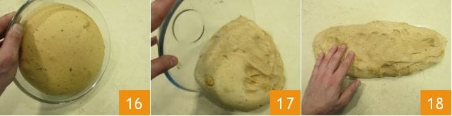 After the necessary time, the dough will have tripled in volume 16; turn it out onto the board 17 and work it with your fingertips until you get a rectangle of 6x12 inches 18.
