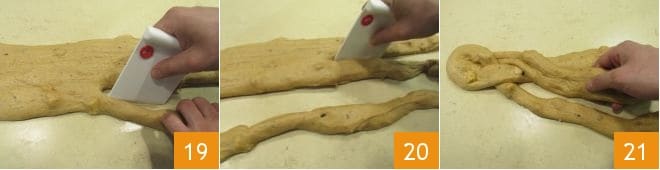 Then with a dough scraper, cut the dough lengthwise 19, thus obtaining 3 strips 20, then join them at one end 21