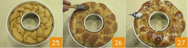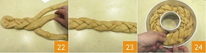 so that you have the part to start braiding the three strips alternately 22, until you get a braid 23. Then place the dough in a lightly buttered 10-inch diameter cake mold 24