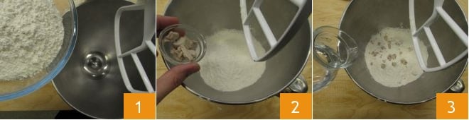 To make the soft flatbreads, pour the flour into the bowl of a stand mixer equipped with a paddle 1, add the crumbled yeast 2 and a little water 3.