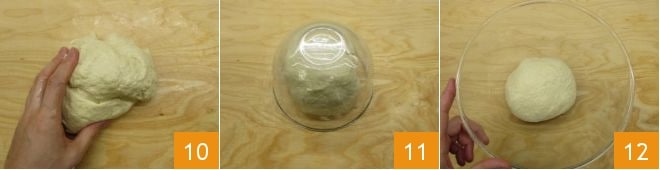 Transfer the dough onto a work surface 10, let it rest under a bowl for 10 minutes 11. Then form a smooth dough ball with your hands, transfer it to a large bowl 12,