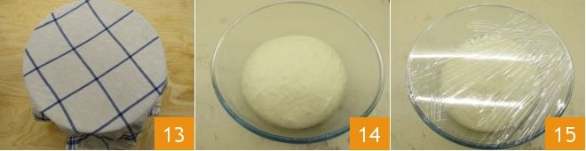 cover with a cloth and let it rise for 3 hours at room temperature 13. After 3 hours 14, cover the bowl with plastic wrap 15 and let it rise in the refrigerator for 10 hours.