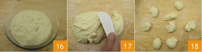 At this point, retrieve the risen dough, let it come to room temperature for about half an hour 16. With the help of a dough scraper, divide the dough into 8 pieces of about 3 oz each (17-18).