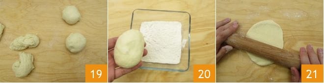 Shape each piece into a round form 19 and let them rest for 5 minutes. Pass each piece in flour 20 and then roll it out with a rolling pin 21 to obtain round flatbreads with a diameter of about 2.5 inches.