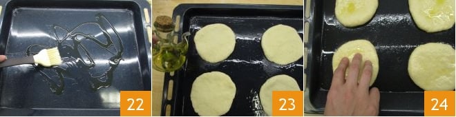 Brush the bottom of a baking sheet with oil 22, place the flatbreads here and drizzle a little oil on each 23 and let the flatbreads rest for another hour. Then pierce the dough with your fingertips 24